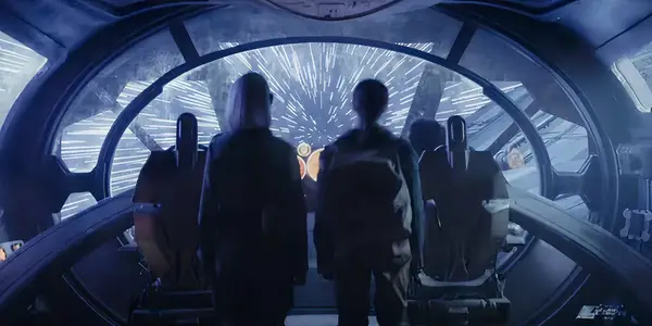 De main children of Skelet -besætning (2024) stoging in a cockpit as they enter hyperspace